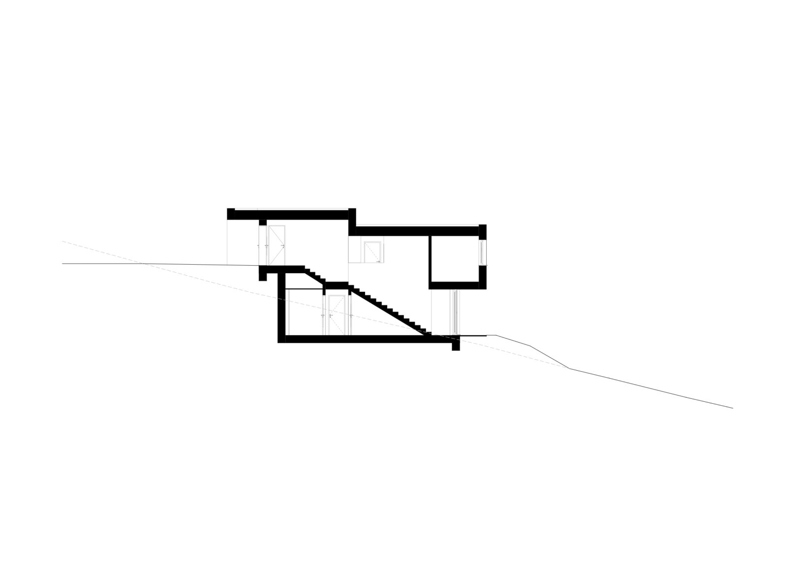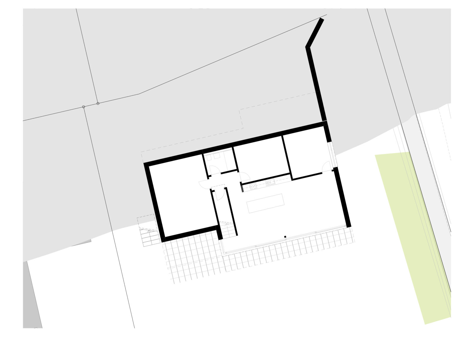 Im oberen Geschoss sind die privateren Räume situiert sowie das separat erschlossene Studio mit Balkon. Im unteren Geschoss befinden sich Küche und Wohnraum mit direktem Zugang zum weitläufigen Aussenraum.
