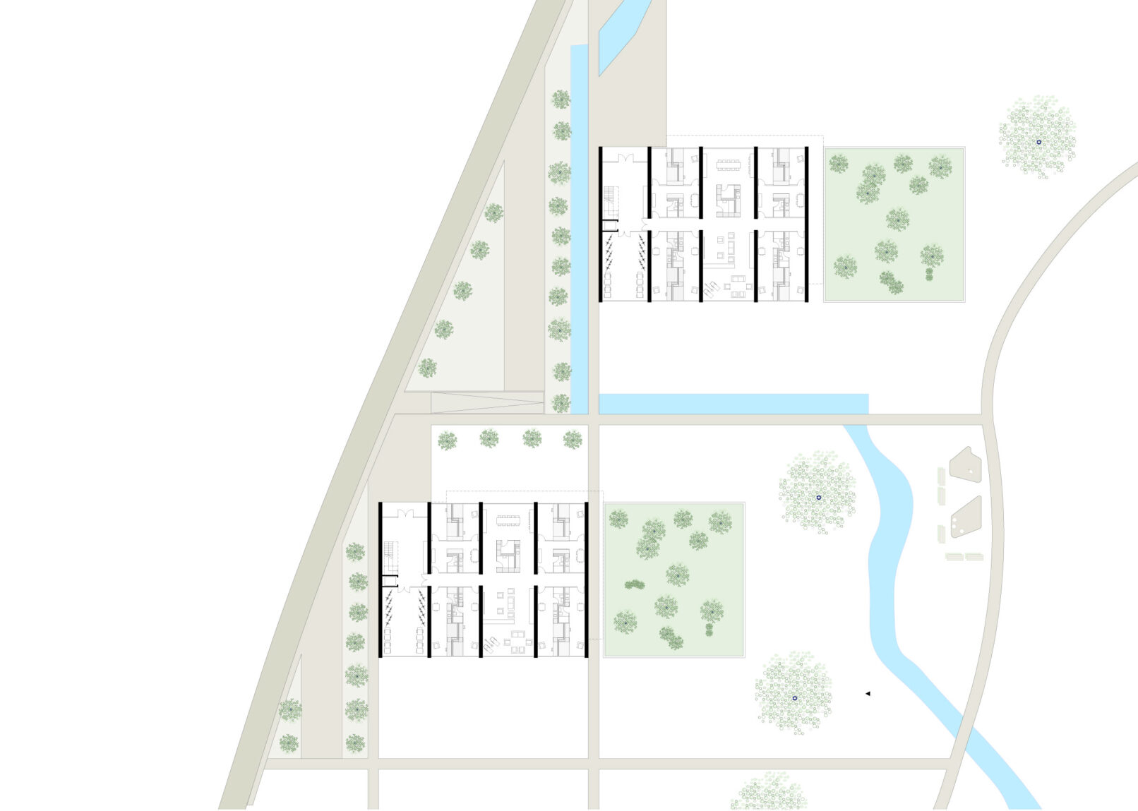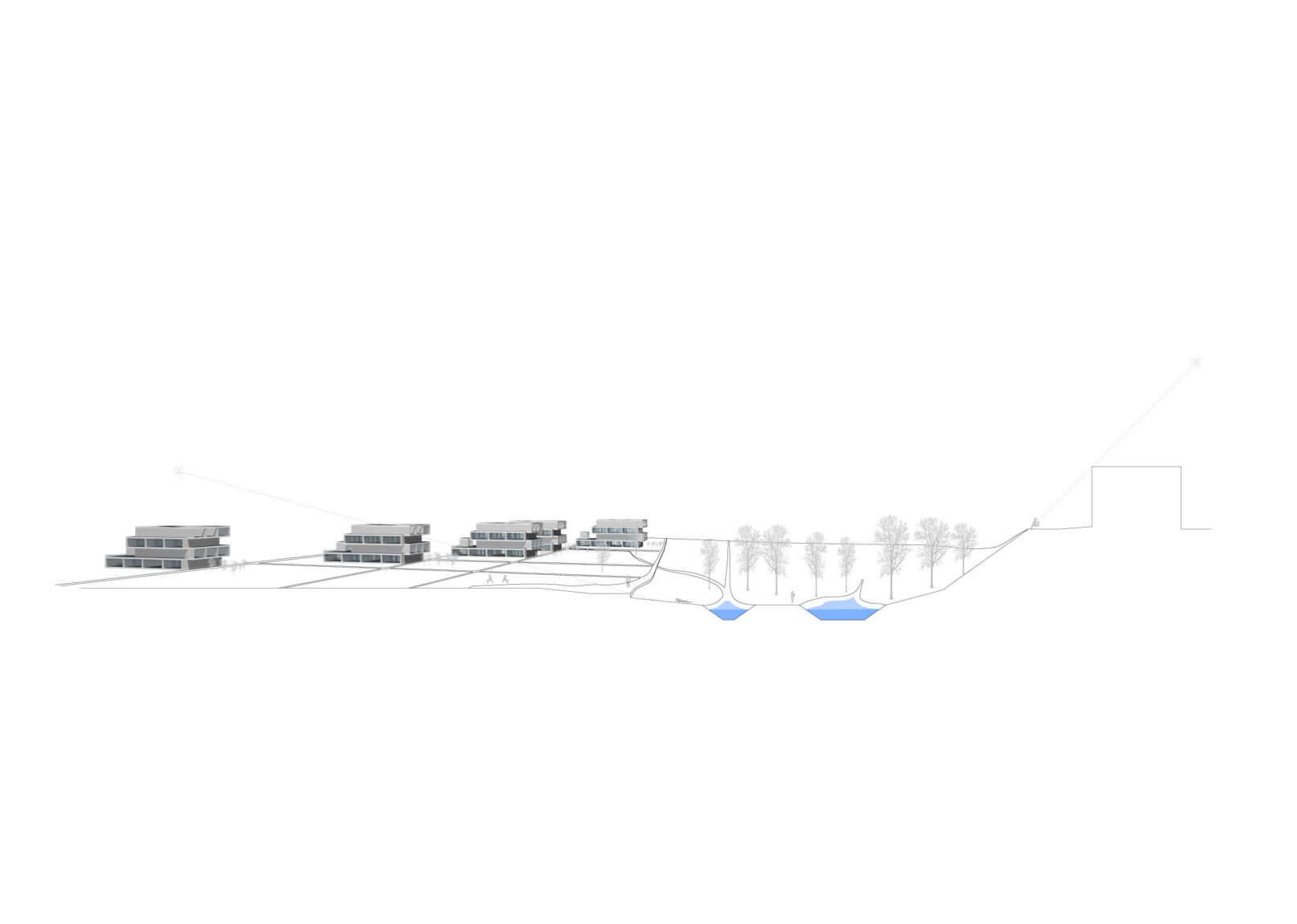 Dieses Projekt ist als klarer Abschluss von Ottenbach zu verstehen. Von aussen als Abschluss der besiedelten Fläche erkennbar ‒von Innen als führender Rahmen der neu gestalteten Grünfläche. Die murale und massive Wirkung der einzelnen Kuben erinnert an Grenzsteine. Ein zusätzliches Merkmal ist, dass diese „Grenzsteine“, wie auch die einzelnen Gebäudeteile in diesem Projekt, in einer grünen Wiese ihren Platz gefunden haben.