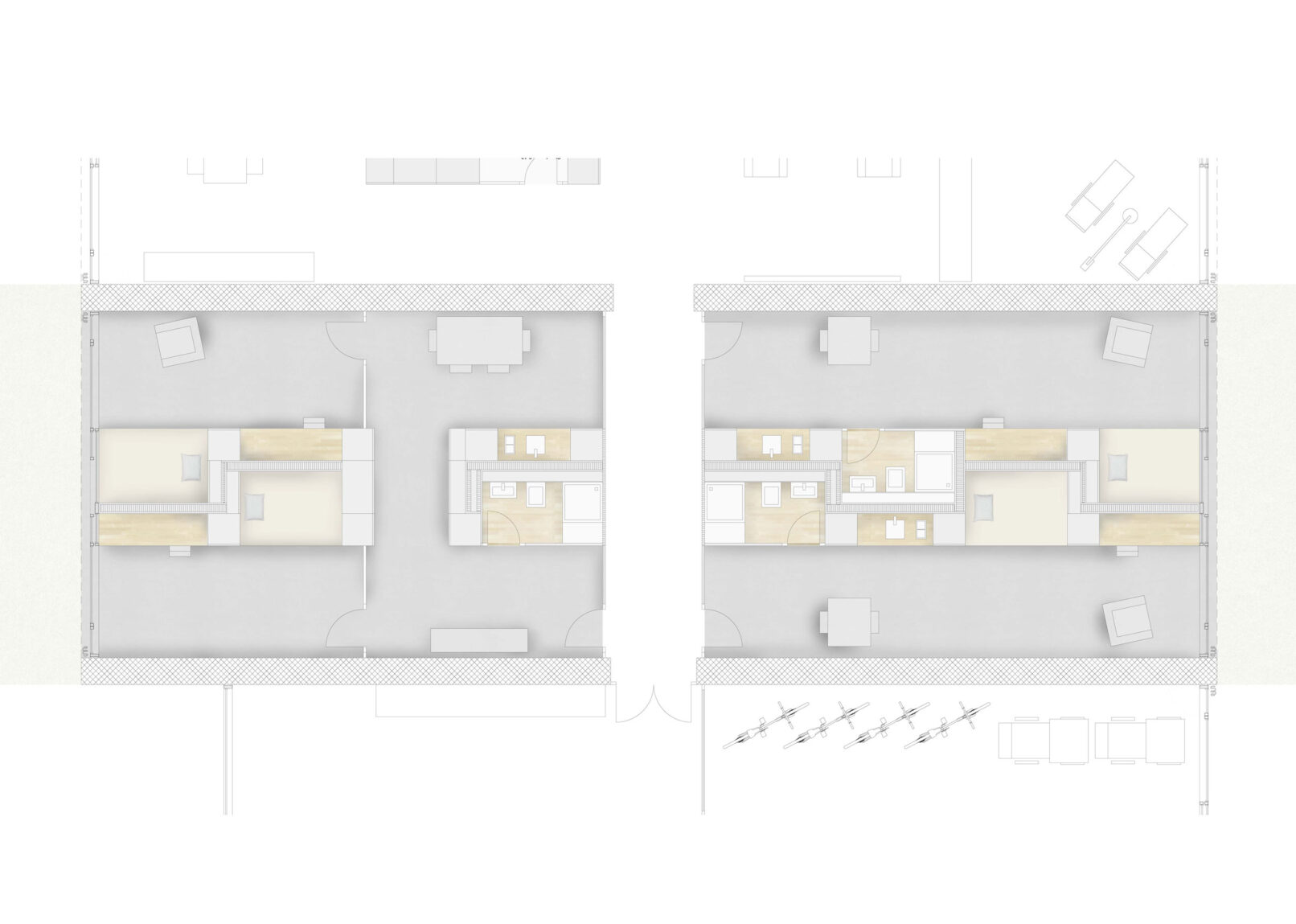 Die direkte Vorzone der Wohnungen ist mit Schotten abgetrennt, um den Einzimmerwohnungen einen kleinen privaten Aussenraum zu bieten. Diese verfügen nur über Kochnischen und teilen sich dafür einen grossen gemeinschaftlich genutzten Wohn- & Küchenraum.