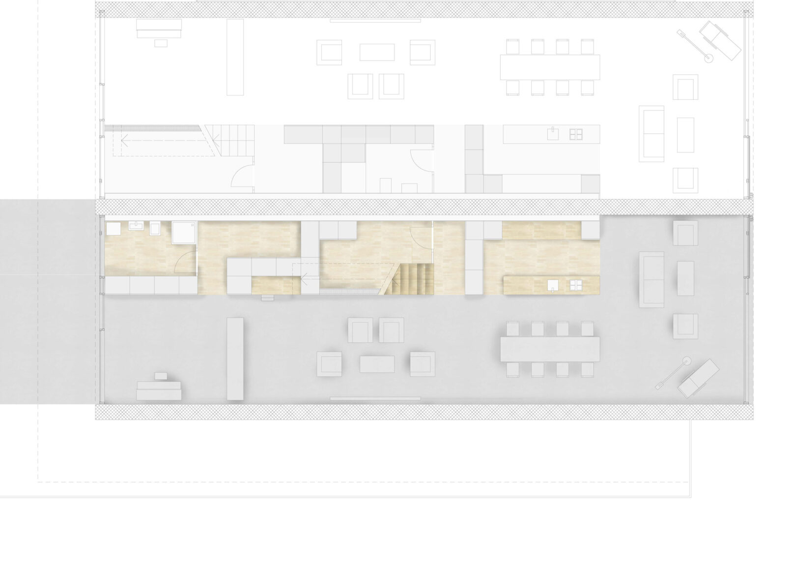 Die Vorzone der Duplexwohnungen ist Erschliessungszone und bietet Platz für gemeinschaftliche Aktivitäten. Hier wird aufeinander getroffen und miteinander Zeit verbracht. Die Gebäudestruktur impliziert jedoch, dass nur die Personen sich dort aufhalten sollen, die auch eine Wohnung in den oberen Geschossen besitzen.