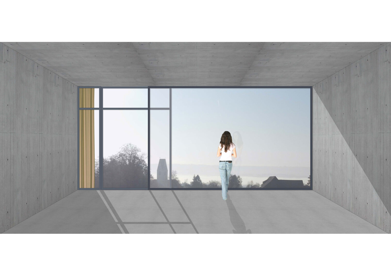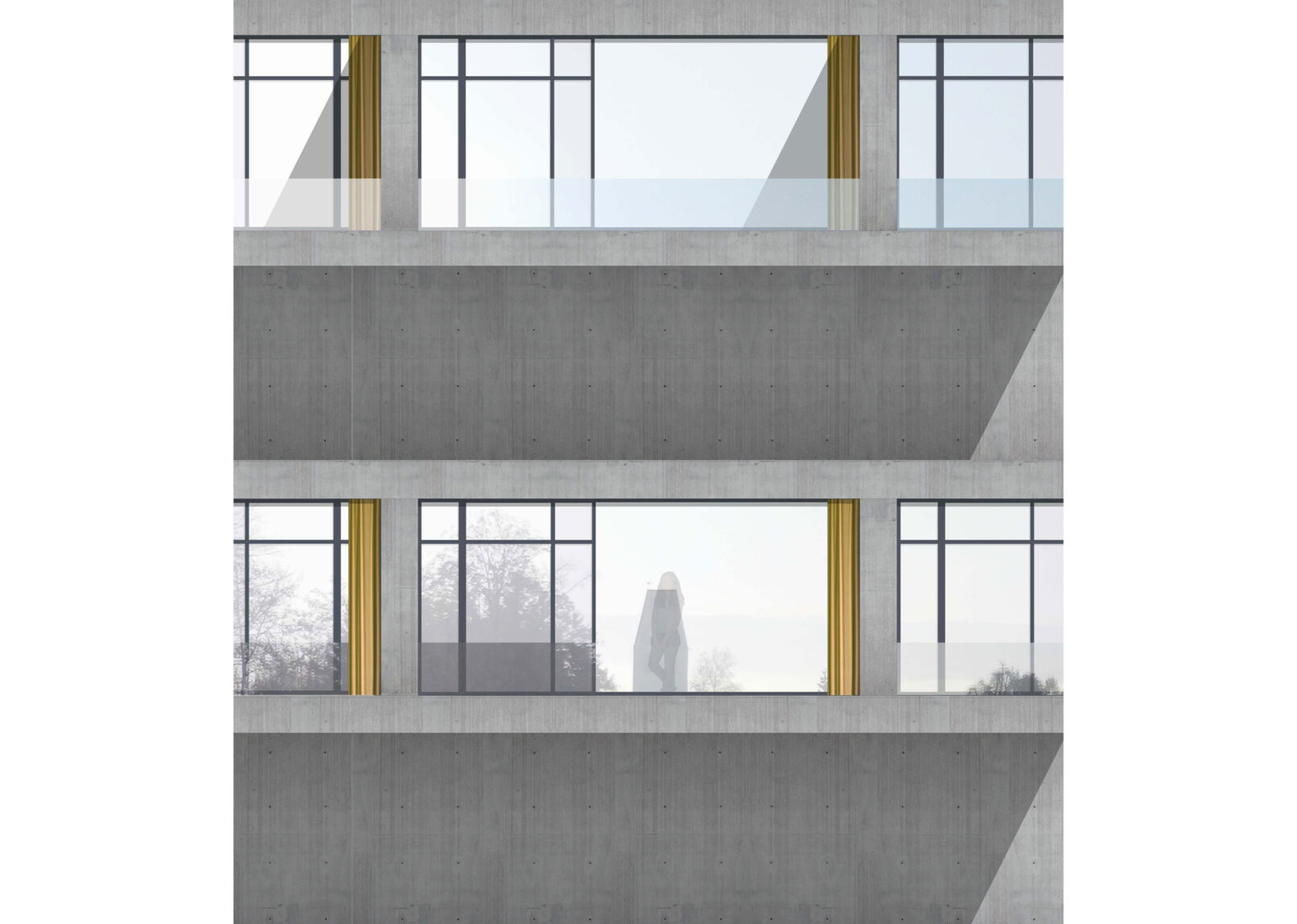Die oberen Geschosse der Duplexwohnungen sind die privatesten Orte der Überbauung. Innen- wie Aussenraum sind abgeschottet von der Öffentlichkeit und suggerieren durch die klar auf die Natur gelenkten Blicke ein absolutes Privatleben.