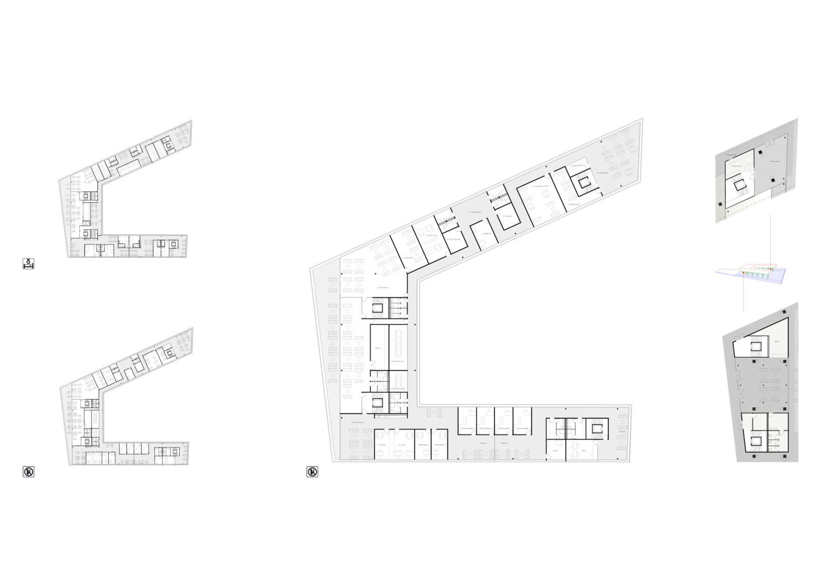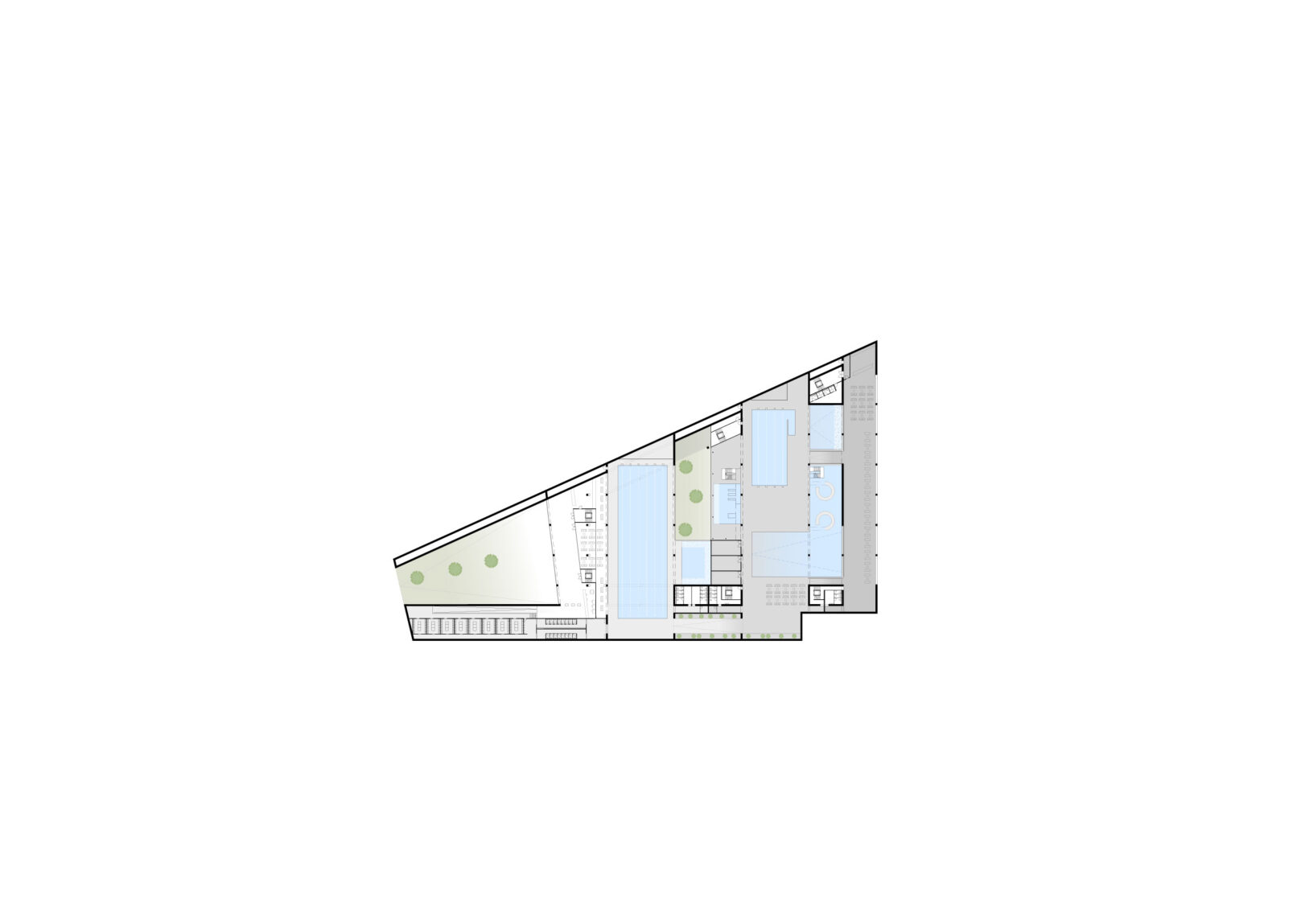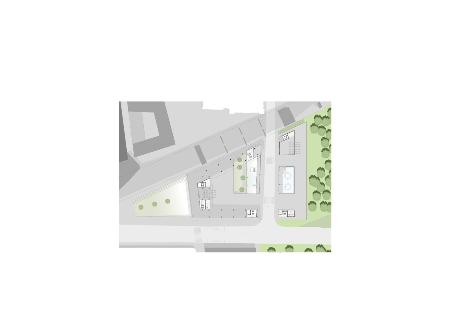 Das Gebäudevolumen das die oberste Ebene darstellt, gibt Raum für Sozialstrukturen wie die Drogenanlaufstelle und andere Beratungsstellen.