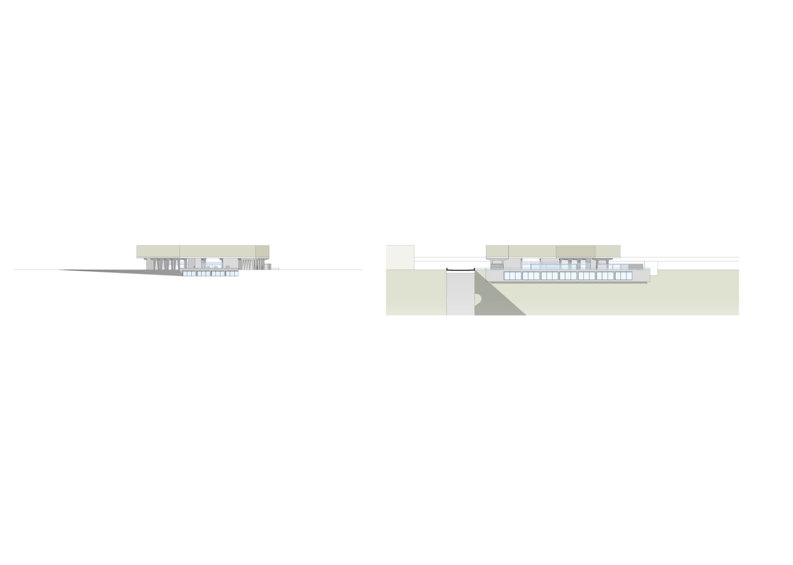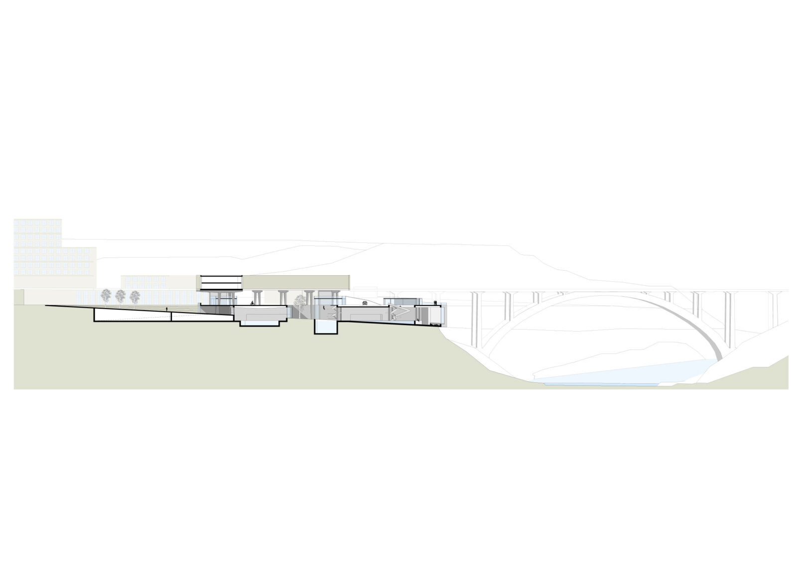 Dieser Körper, der wie die anliegende Bahnbrücke auf Stützen steht, strukturiert das Erdgeschoss und ermöglicht Anlässe unter einem Dach, wie ein Pavillon in einem Park.